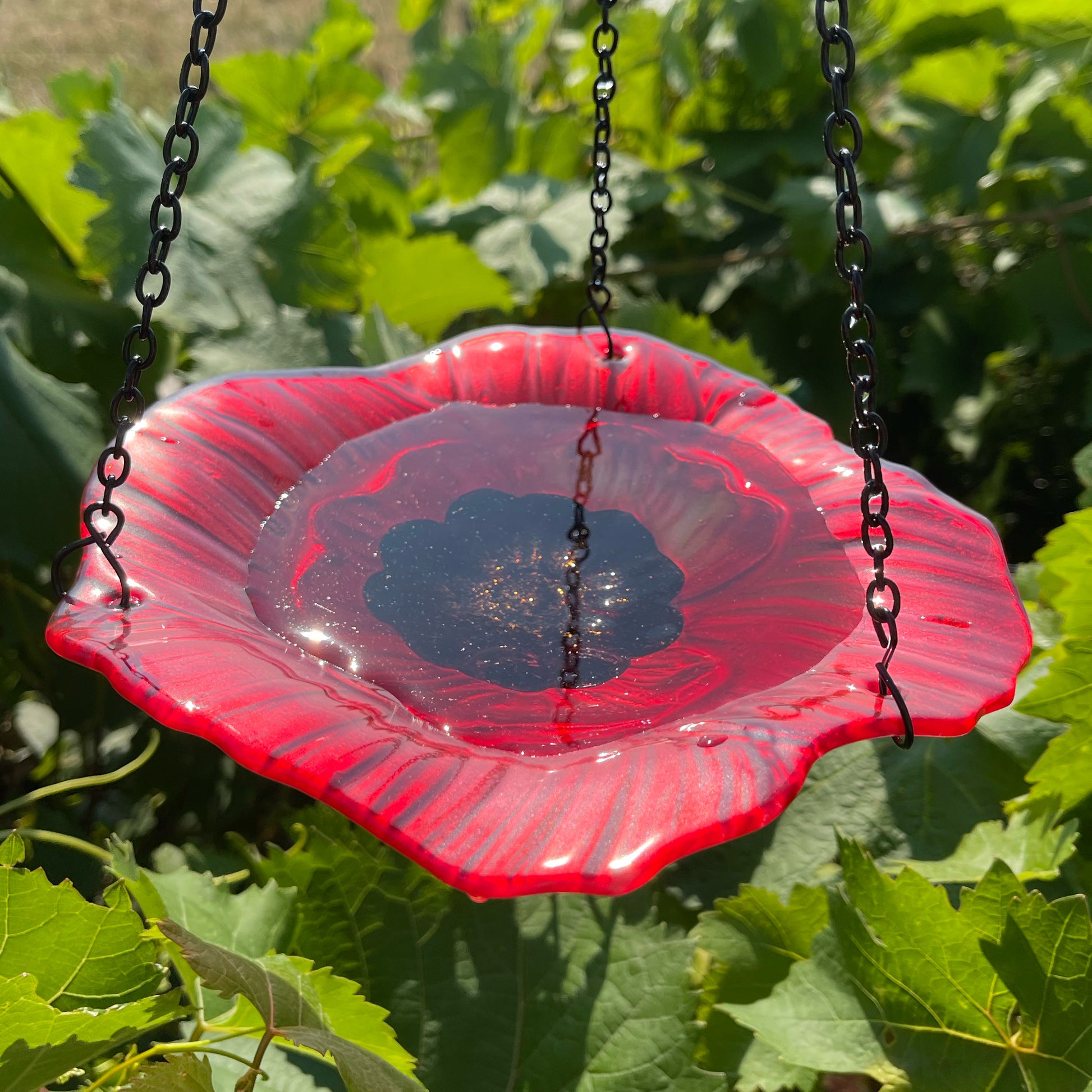 Bursting with colour, this decorative bird bath showcases a vivid poppy design. Perfect for providing fresh water or acting as a striking garden accent.