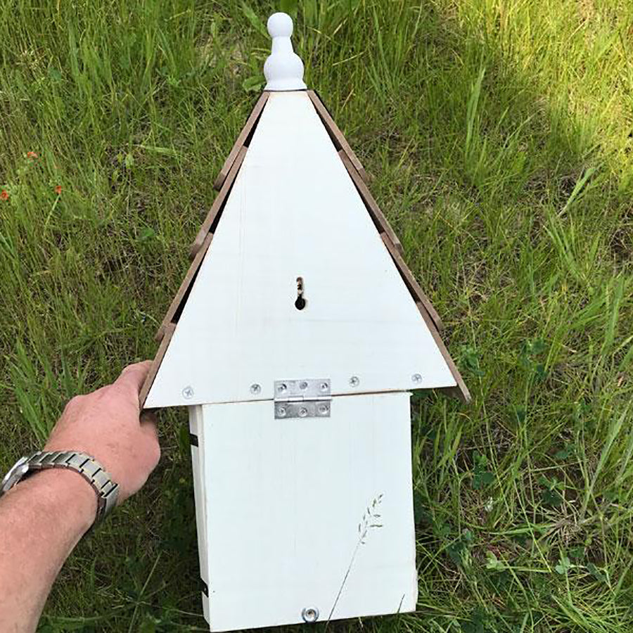 sustainable timber, handmade roof shingles with a white finial top whilst the nest box is strengthened with two steel straps. The back of the dovecote is flat with a keyhole hang and a hinged door provides access for cleaning out at the end of the nesting season. The dovecote bird box has a shabby chic finish which can be coated each season to maintain appearance.