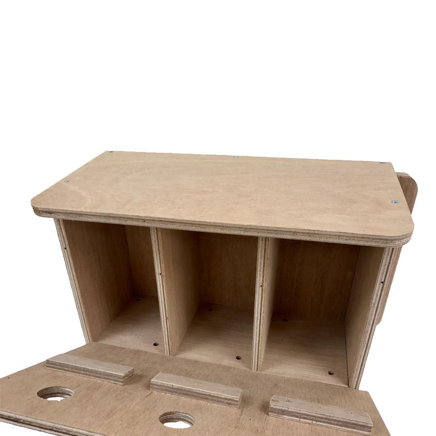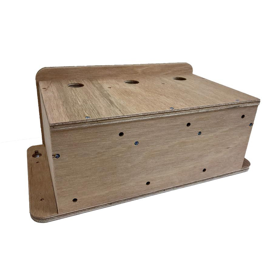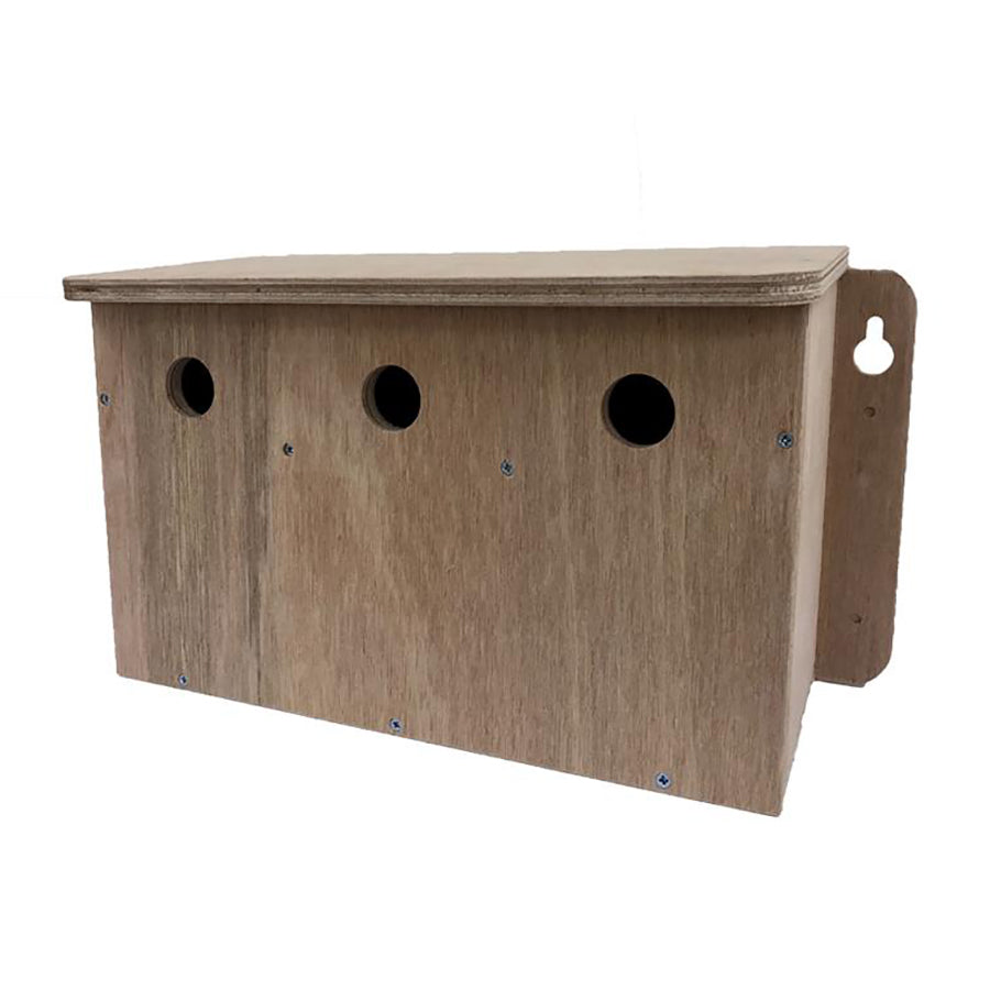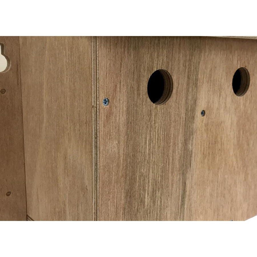 This high quality sparrow nesting box will prove very durable and resistant to UK weather conditions. Hand crafted in our own workshops from high grade 12mm resin bonded ply with each panel having been screwed together. We have designed the fixings to each side of the box with x4 optional screw through guides or a keyhole fixture for lift on/off, really handy if you intend to place the box high up under eaves for instance. The roof of the sparrow house slopes forward to quickly disperse rain water down and off the overhang. This triple sparrow terrace incorporates 3 separate nesting chambers each having a 32mm entrance hole, an internal perch and drainage aeration in the base. The front panel can easily be removed for inspection and cleaning of the multi sparrow nests by undoing the holding screws.