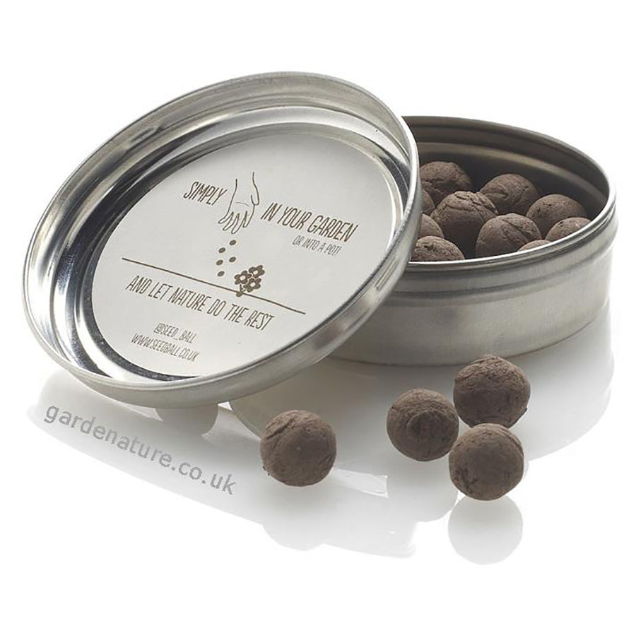 Each seed ball contains a mini ecosystem: wildflower seeds are mixed with clay, peat-free compost and a smidgen of chili powder, and rolled into a small ball. Each ball is approximately 1 cm in diameter, making them so easy to just scatter. The dried clay acts as a protective casing from common seed predators (such as ants, mice and birds). When sufficient rain permeates the clay, the seeds inside begin to germinate - helped along by the nutrients and minerals contained within the balls. The chili powder continues to deter predators while the seed ball slowly degrades and the seeds sprout.