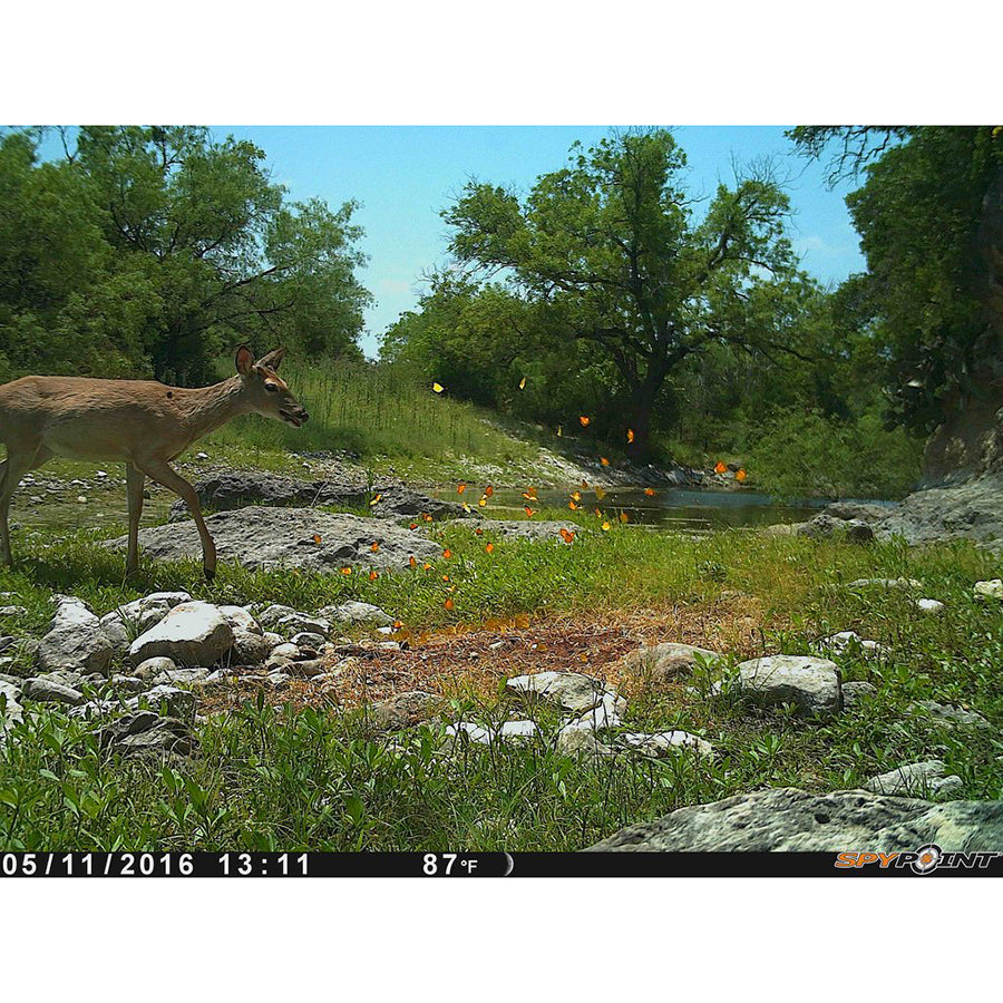 This Spypoint trail camera uses 42 high-power low-glow LED's to offer the best night time images.The curved motion sensor lens improves the detection angle and distance of its 3 detection zones. The detection range can also be adjusted from 5ft' out to 80ft'. The camera has an incredible battery life when powered by 8 AA batteries and even longer when using AA Lithium batteries